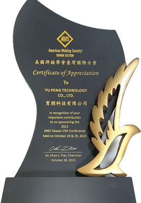 2023年10月 獲頒美國焊接學會台灣分會獎座本公司為追求技術精進,派人員參加美國焊接協會台灣分會焊接研習並取得焊接檢驗師證照。