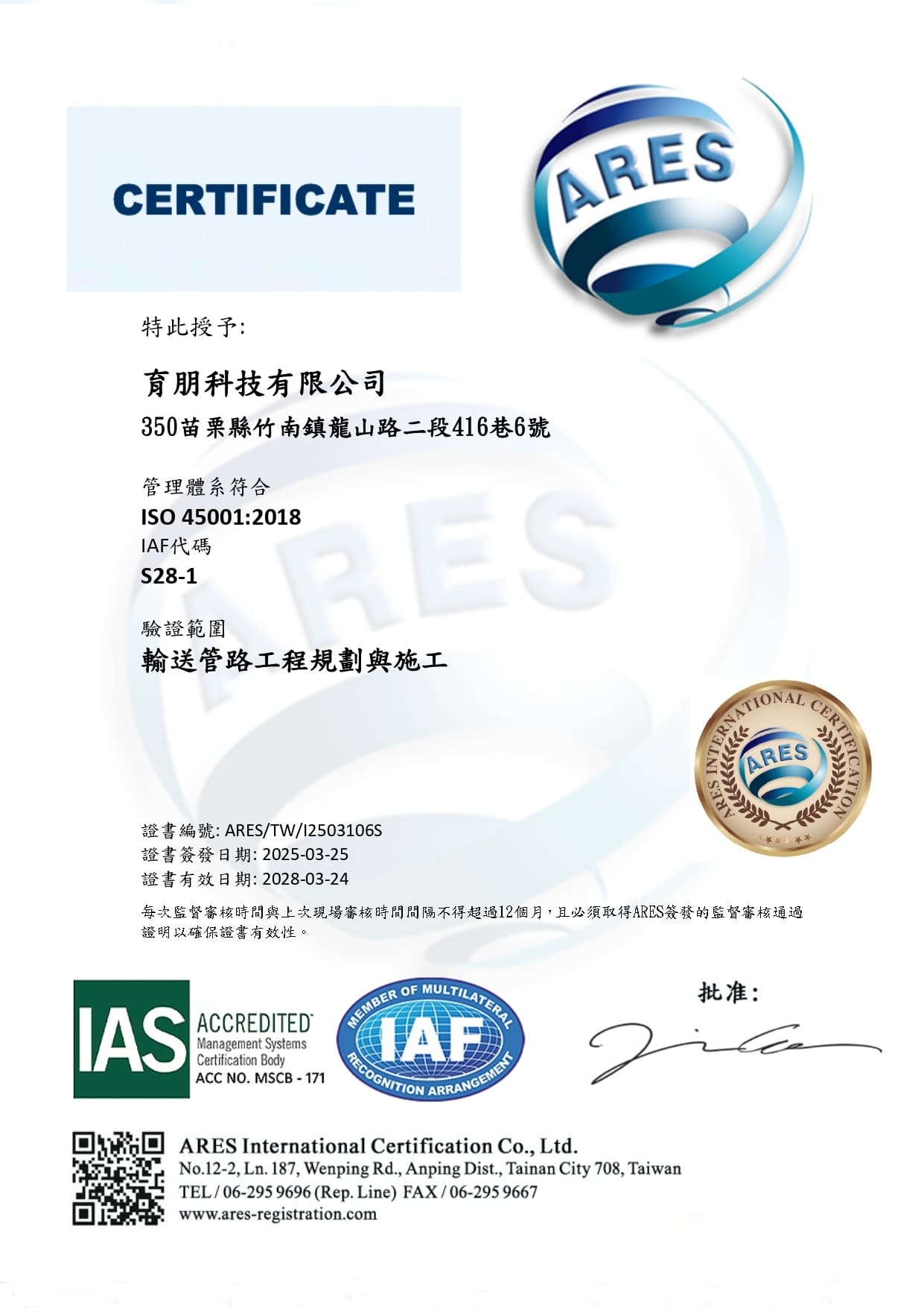 2025年1月 賀本公司通過 ISO 45001 職業安全衛生管理系統 認證。